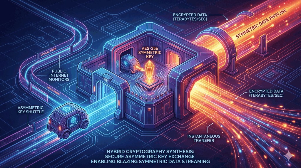 - Kryptografia asymetryczna służy tu jedynie do bezpiecznego przesłania klucza sesji (klucza symetrycznego).