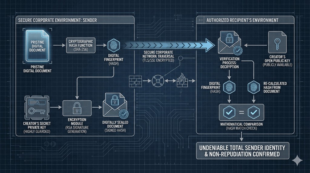 - Następnie szyfruje ten skrót swoim kluczem prywatnym, tworząc unikalną cyfrową „pieczęć" – podpis.