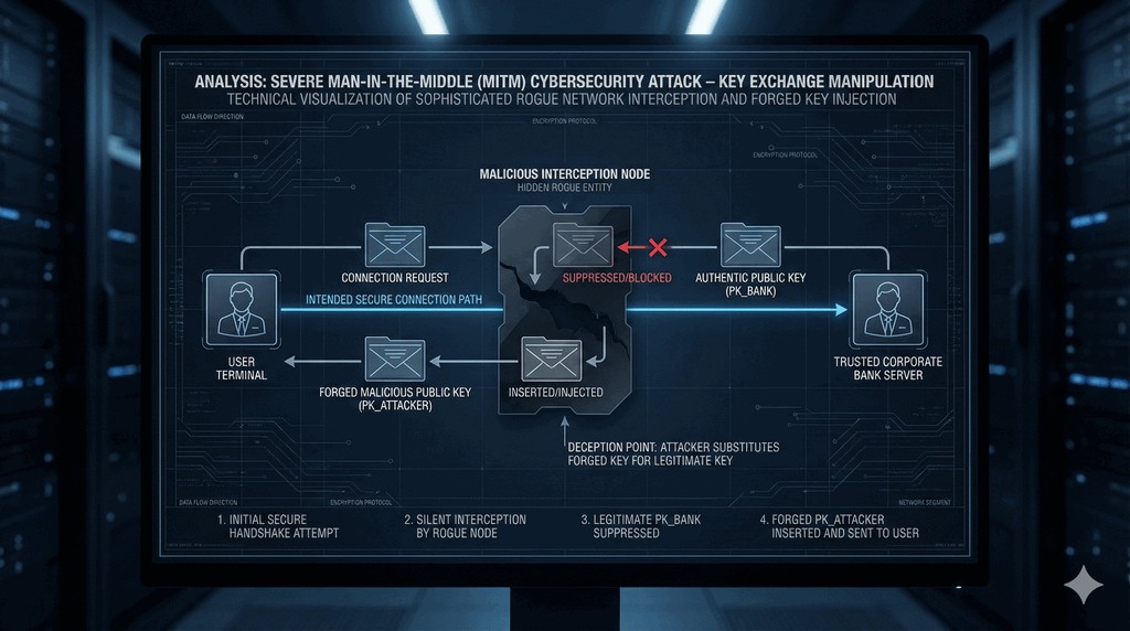 - Atakujący podmienia prawdziwy klucz publiczny banku na swój własny, fałszywy klucz.