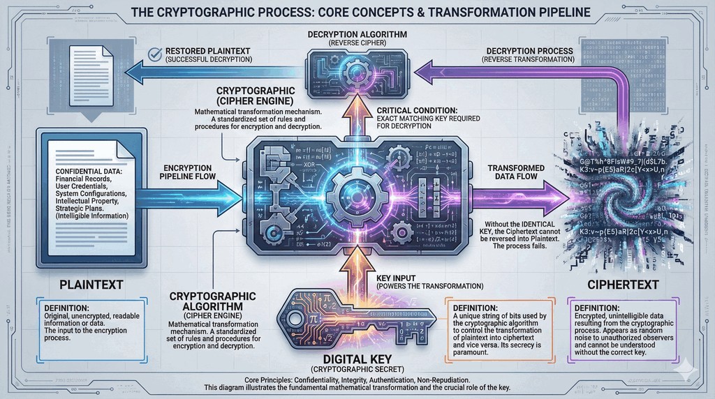 - Szyfrogram (Ciphertext) to nieczytelna postać danych powstała po zaszyfrowaniu.