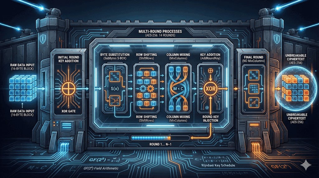 - Jest to szyfr blokowy, który przetwarza dane w blokach o wielkości 128 bitów.