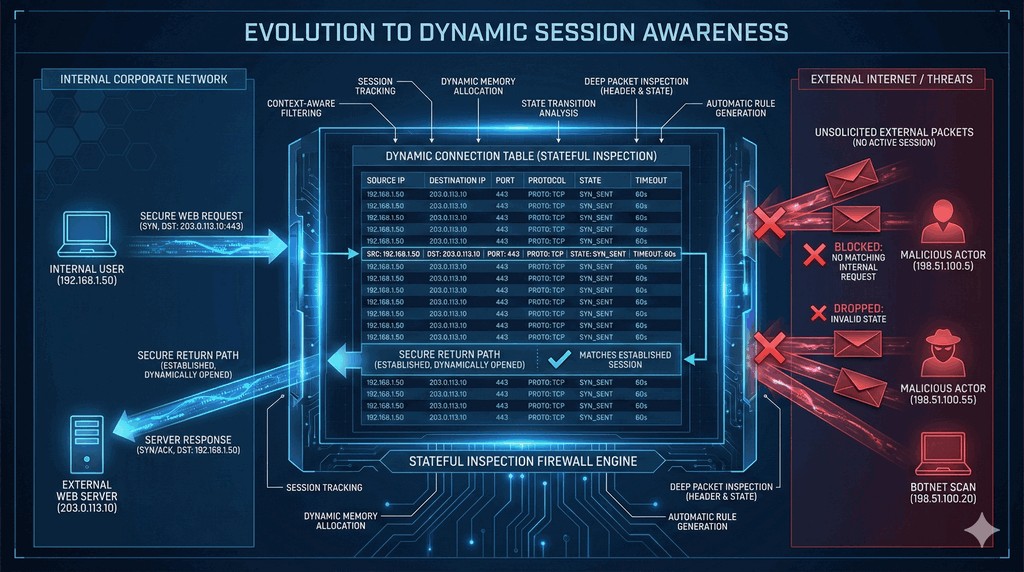 - Rozwinięciem funkcji starszych zapór były firewalle stanowe (Stateful Firewall), które wprowadziły analizę stanu połączeń sieciowych (Stateful Inspection).
