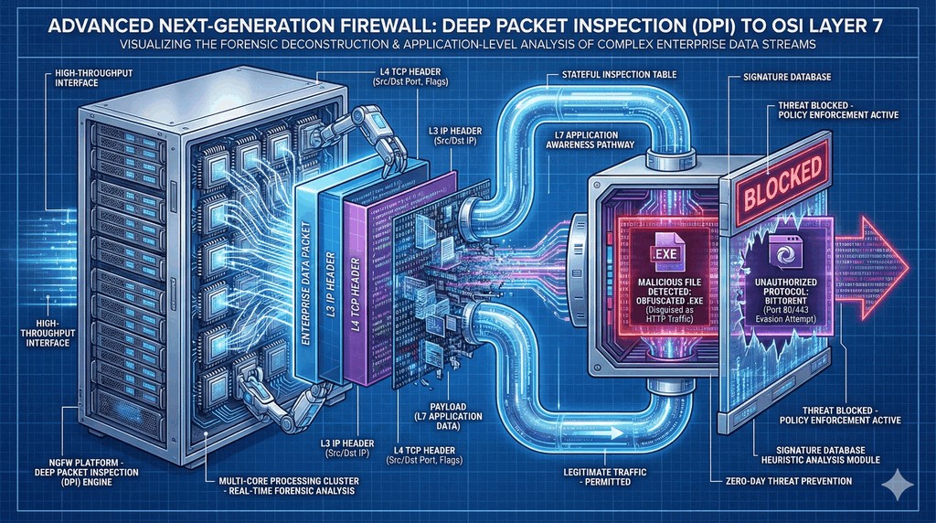 - Dzięki technologii DPI (ang. Deep Packet Inspection – głęboka inspekcja pakietów), zapora NGFW skanuje ruch głęboko wewnątrz pakietu, aż do siódmej warstwy modelu OSI (warstwy aplikacji).