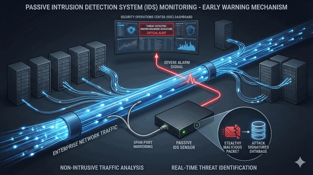 - IDS działa jako pasywny czujnik podłączony z boku struktury sieciowej, który odbiera kopie pakietów (np. dzięki konfiguracji portów SPAN na przełącznikach).