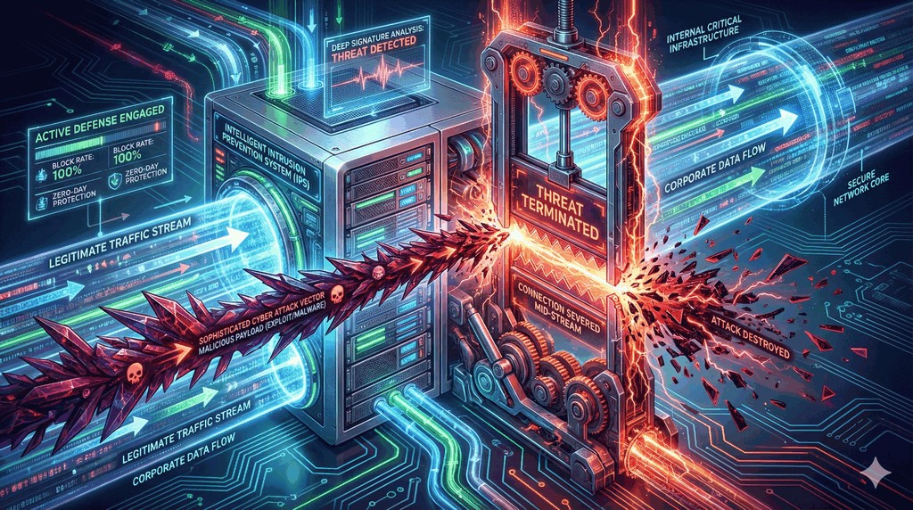 - Jeśli moduł IPS rozpozna sygnaturę charakterystyczną np. dla ataku ransomware, sprzętowo przerywa połączenie, odrzucając zagrożenie.