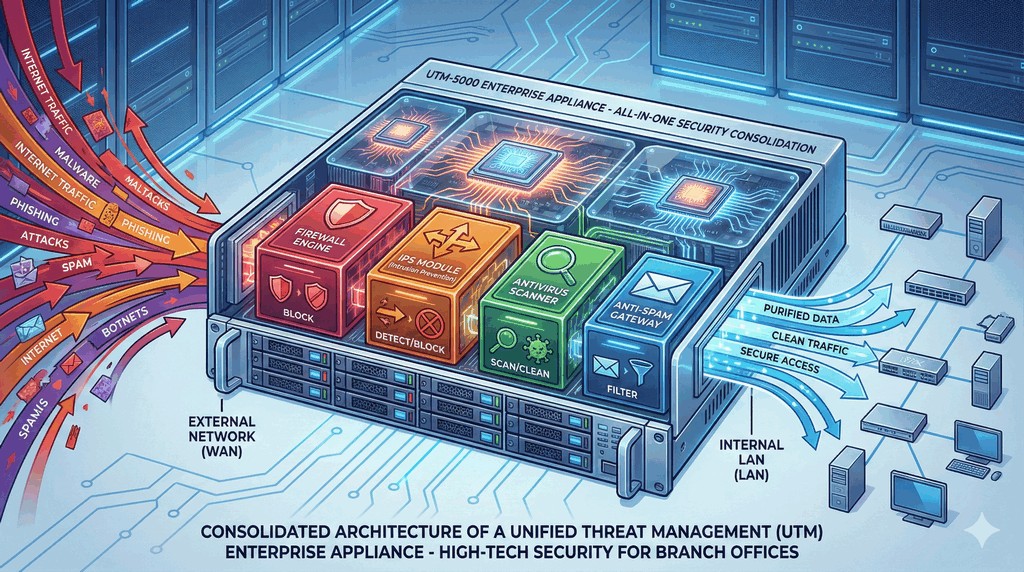 - Zapewniają zintegrowaną ochronę, zawierając w sobie m.in.: zaporę sieciową, moduł IPS, systemy antywirusowe, filtrowanie stron WWW oraz analizę antyspamową.