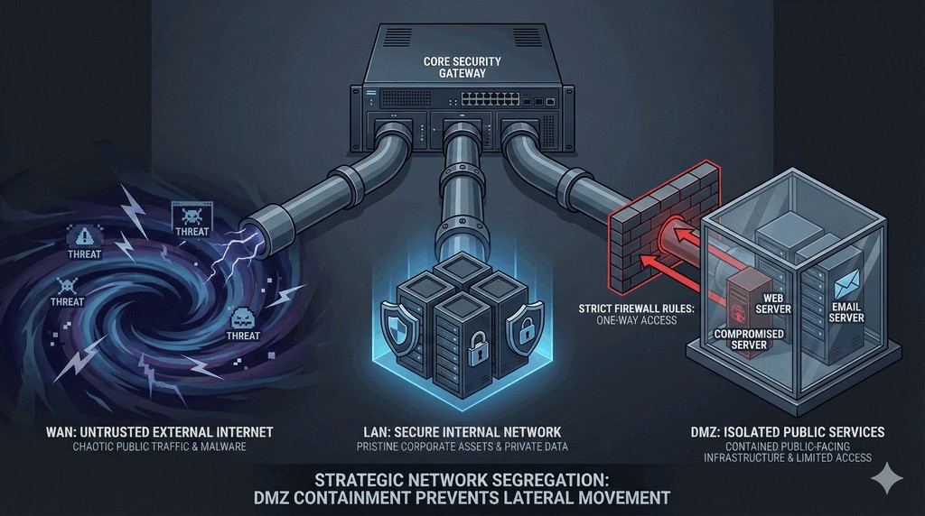 - Dzięki tej separacji, nawet jeśli serwer w strefie DMZ zostanie przejęty, intruz nie będzie w stanie bezpośrednio połączyć się z siecią pracowniczą.