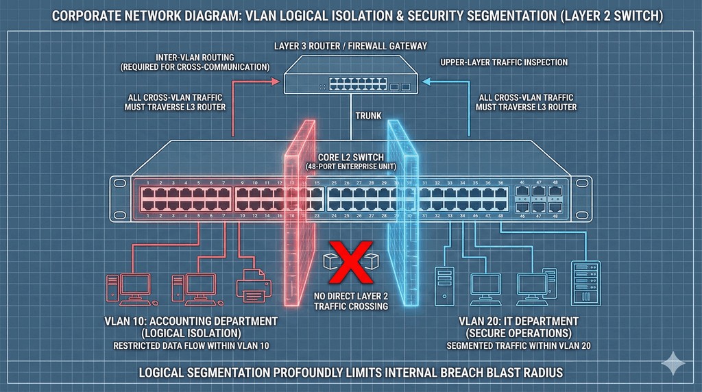 - Pozwala to na logiczne grupowanie portów przełącznika (switcha) i izolację ruchu – np. rozdzielenie komputerów działu księgowości od urządzeń programistów.