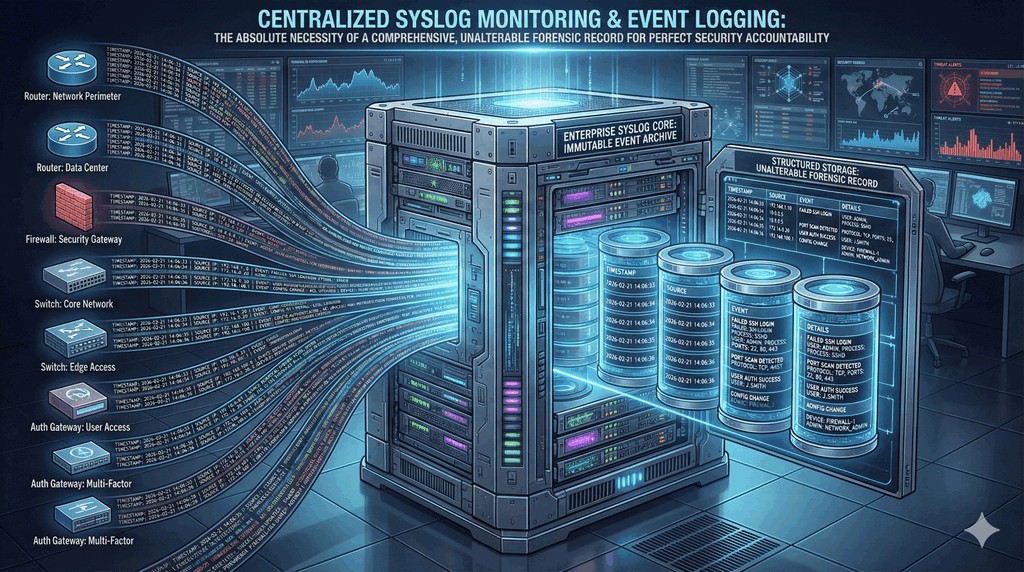 - Każde urządzenie w sieci (routery, przełączniki, systemy UTM) na bieżąco przesyła informacje o statusie pracy oraz nieautoryzowanych próbach połączeń.