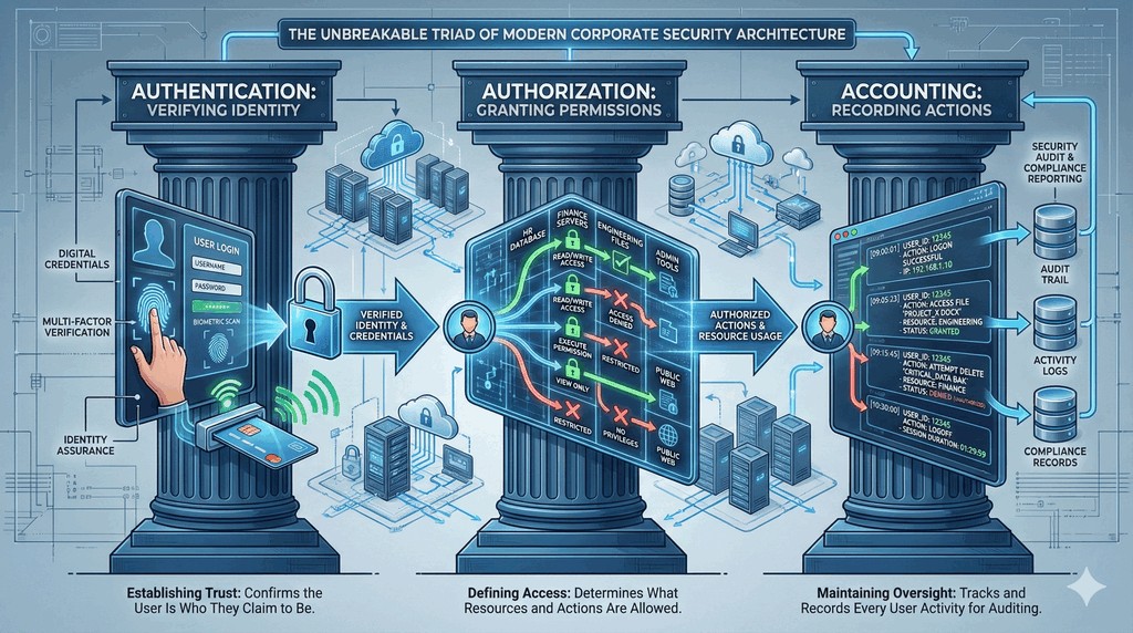 - Poznamy architekturę uwierzytelniania opartą na modelu AAA oraz zasady tworzenia silnych haseł.