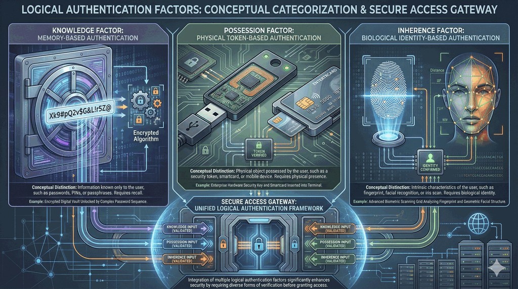 - Proces uwierzytelniania w sieciach opiera się na trzech głównych czynnikach potwierdzających tożsamość.
