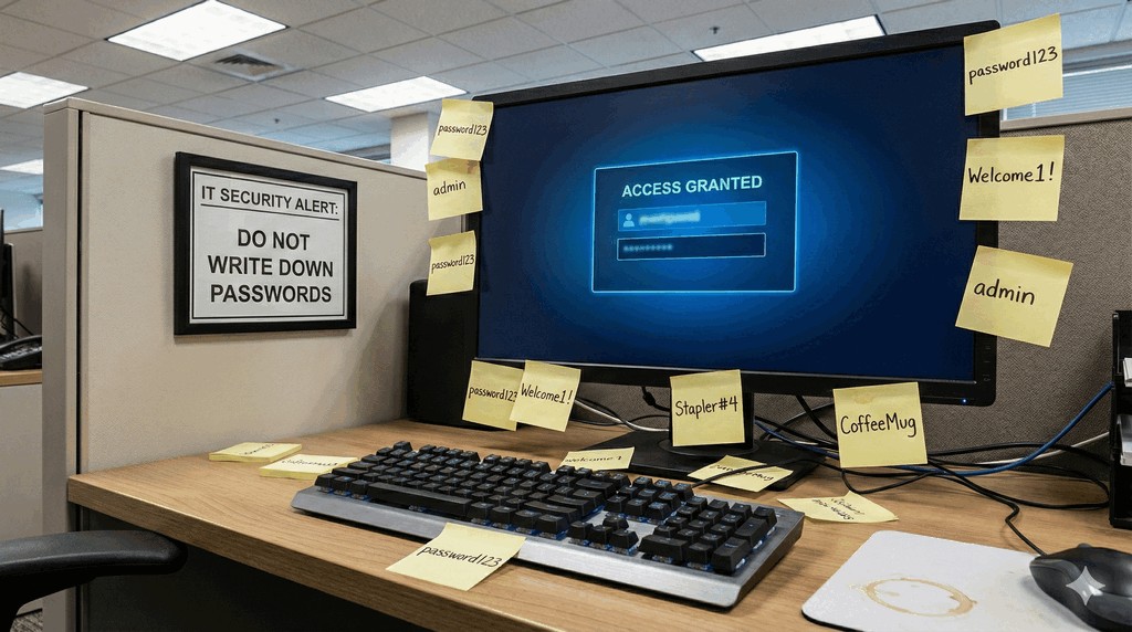 - Zbyt rygorystyczna polityka haseł często prowadzi do ich omijania, np. poprzez zapisywanie skomplikowanych ciągów znaków na karteczkach przyklejanych do monitora.