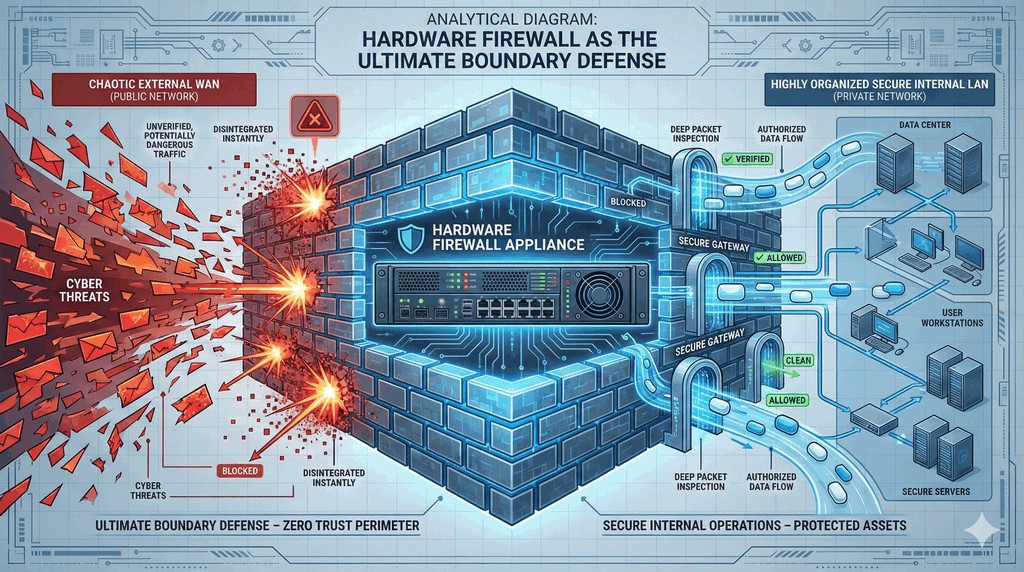 - Ich kluczowym zadaniem jest analiza ruchu sieciowego na styku z Internetem i blokowanie nieautoryzowanych połączeń.