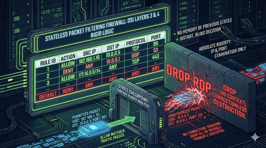 - Historycznie pierwszymi rozwiązaniami zabezpieczającymi na brzegu sieci były tzw. zapory bezstanowe (Stateless Firewall).